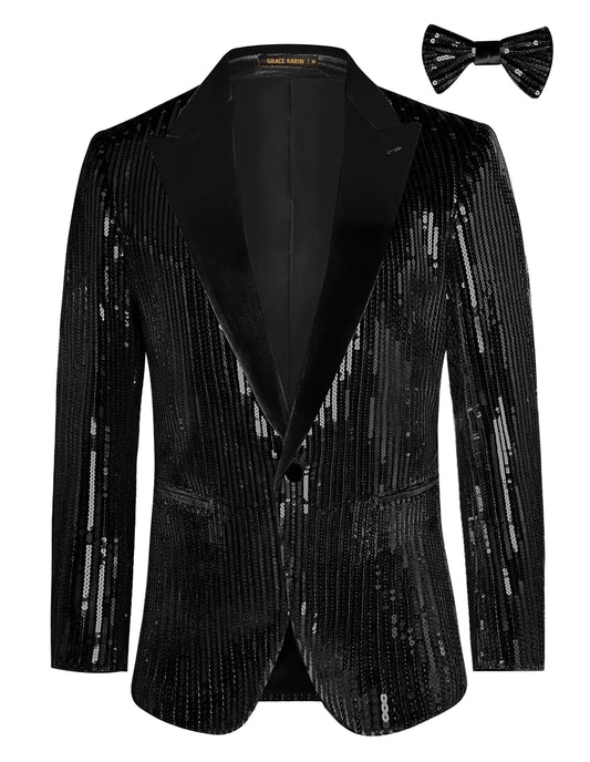 GRACE KARIN Men's Sparkle Sequin Tuxedo Blazer Slim Fit Single Button for Events Black Small