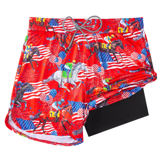 Men's USA Flag Horse Racing Swim Trunks with Compression