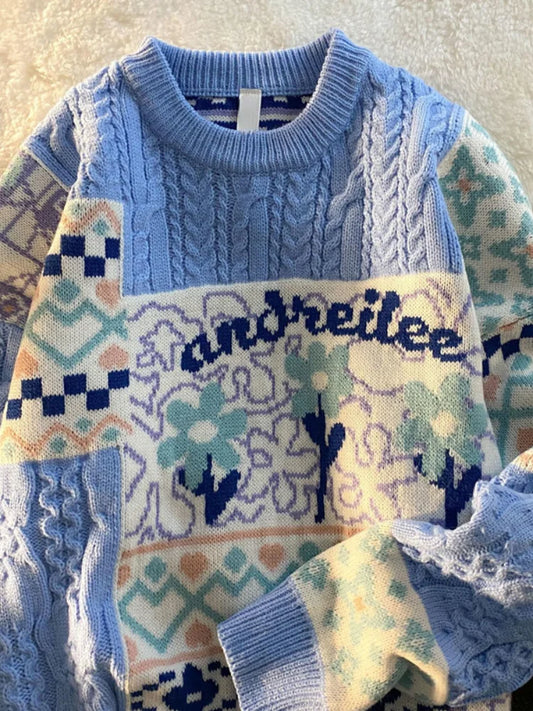 KOSAHIKI Vintage Floral Print Loose Sweater for Women