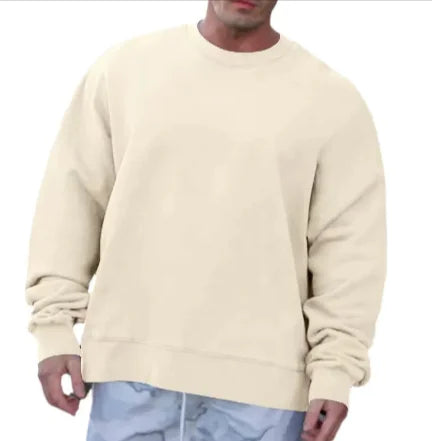 Soft fleece-lined pullover for cozy, everyday comfort. Available in solid colors with a relaxed Harajuku fit. Ideal for casual wear or light sports activities. Simple round neck and fold-stitched details for style.